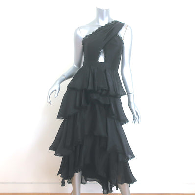AMUR Lena One-Shoulder Cutout Midi Dress Black Ruffled Linen-Silk Size 00