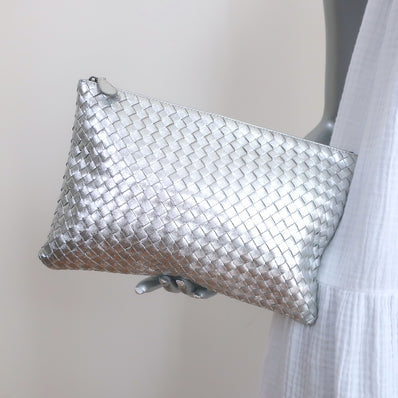 Bottega Veneta Medium Intrecciato Pouch Silver Metallic Leather Flat C...