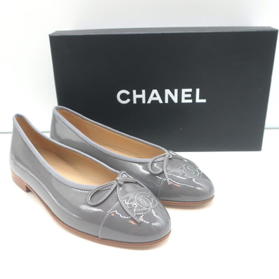 Chanel 15S CC Cap Toe Ballet Flats Gray Patent Leather Size 36 NEW