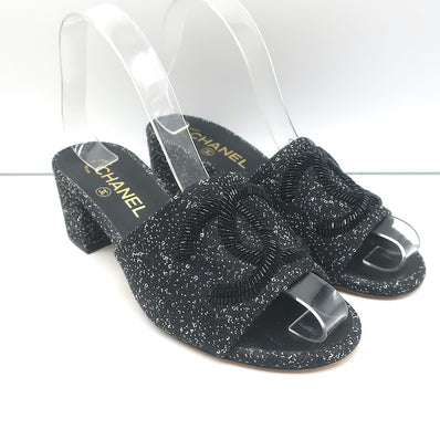 Chanel 19P Beaded CC Slide Sandals Black Sequined Tweed Size 37 Open T...