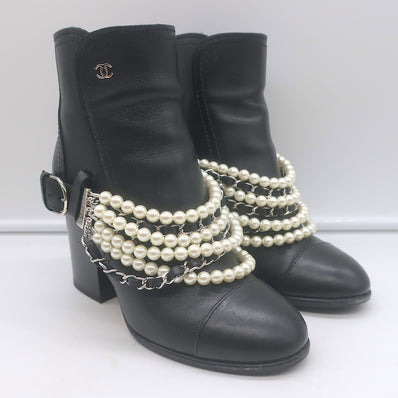Chanel 18A Pearl & Chain-Embellished Ankle Boots Black Leather Size 35.5