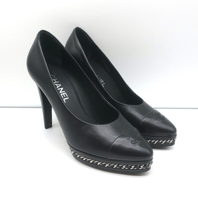 Chanel 14B CC Cap Toe Chain Platform Pumps Black Leather Size 38.5