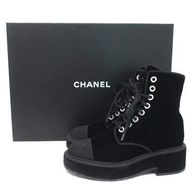 Chanel 17B CC Cap Toe Combat Boots Black Velvet Size 37.5 Lace-Up Ankl...