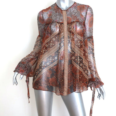 Chloe Blouse Brown Floral Print Silk Chiffon Size 34 Tie-Sleeve Top