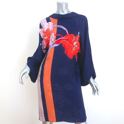 Etro Dress Navy Floral Print Satin Jacquard Size 42 V-Back Shift