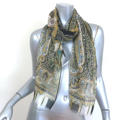 Etro Fringed Silk Chiffon Scarf Black/Yellow Paisley Print