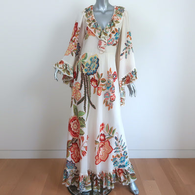 Etro Maxi Dress Monterey Ivory Floral Print Ruffled Silk Size 42 V-Nec...