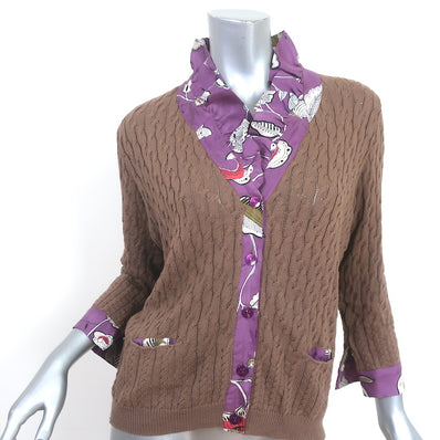 Etro Ruffled Silk-Trim Cardigan Brown Cotton Cable Knit Size 46