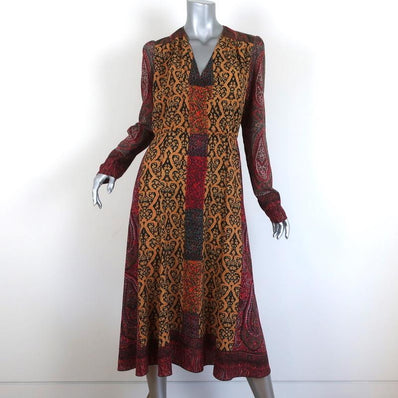 Etro Midi Dress Paisley Print Stretch Crepe Size 44 Long Sleeve V-Neck