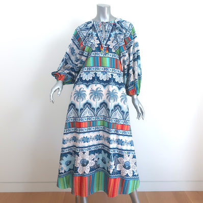 FARM Rio Balloon-Sleeve Midi Dress Blue Palms Print Cotton Size Extra ...