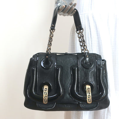 Fendi B Bag Black Patent-Trimmed Leather Chain Strap Small Shoulder Bag