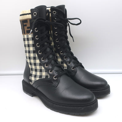 Fendi Rockoko FF Check Knit Combat Boots Black Leather Size 35