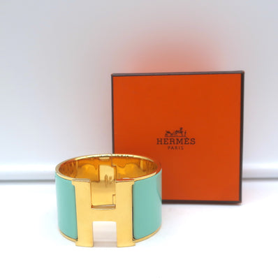 Hermes Extra Wide Clic Clac H Cuff Bracelet Vert Aqua Enamel Gold Hard...