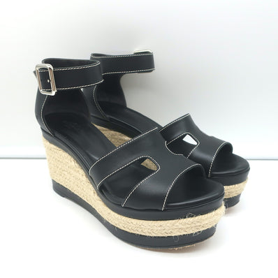 Hermes Ilana Espadrille Wedges Black Leather Size 37 Platform Sandals