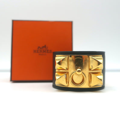 Hermes Collier de Chien Cuff Bracelet Black Leather Gold Hardware Size...