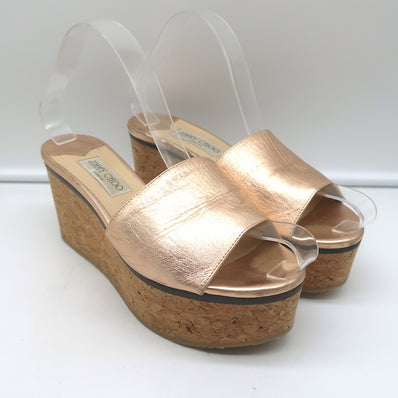 Jimmy Choo DeeDee Cork Platform Wedge Sandals Rose Gold Metallic Leath...