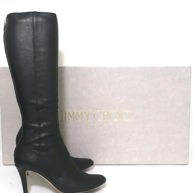 Jimmy Choo Grand Knee High Boots Black Grained Leather Size 37.5
