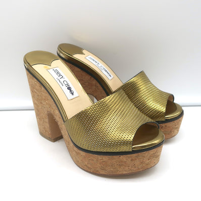 Jimmy Choo Deedee 125 Cork Platform Sandals Gold Metallic Leather Size...
