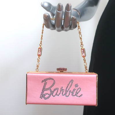 Judith Leiber x Barbie crystal-embellished minaudiere in pink satin offers a whimsical, statement-making finish to evening looks while showcasing the fine craftsmanship...
