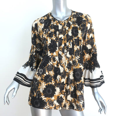 Kobi Halperin Top Mustard/Navy Floral Print Size Small Bell Sleeve Blouse