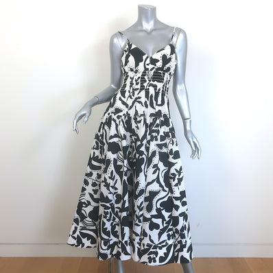 La Ligne Bee Smocked Midi Dress White/Black Printed Cotton Poplin Size...