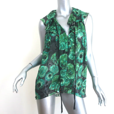 Lanvin Ruffle Blouse Green Floral Print Chiffon Size 36 Sleeveless Top