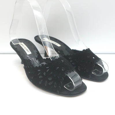 Manolo Blahnik Laser Cut Mules Black Suede Size 38 Kitten Heel Sandals