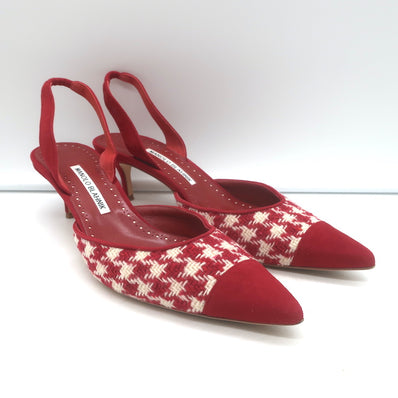 Manolo Blahnik Carolyne 50 Houndstooth Tweed Slingback Pumps Red Suede...