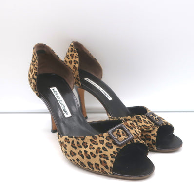 Manolo Blahnik Leopard d’Orsay Pumps Brown Suede Size 37.5 Open Toe Heels