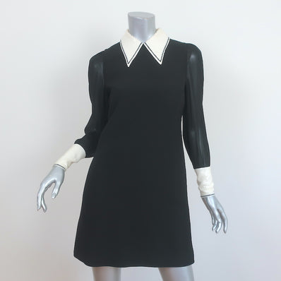 Miu Miu crochet-collar bicolor cady puff-sleeve mini dress in black and white, Size 40 is a striking example of the house’s playful-yet-refined...