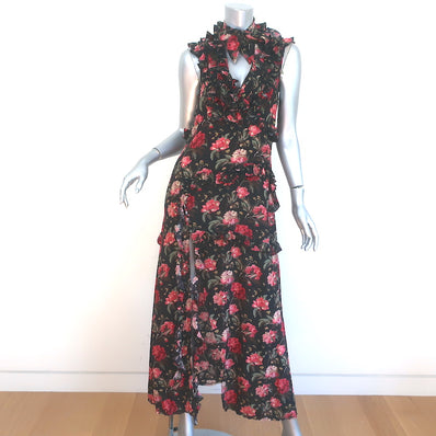 R13 Ruffle Slit Dress Black Floral Print Silk Size Medium Sleeveless Maxi