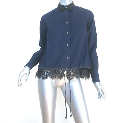 Sacai Drawstring Hem Shirt Navy Lace-Trim Cotton Size 1 Long Sleeve Top