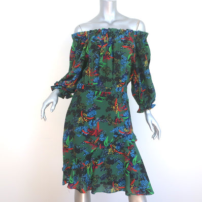 SALONI Off the Shoulder Dress Grace Green Floral Print Silk Size US 10...