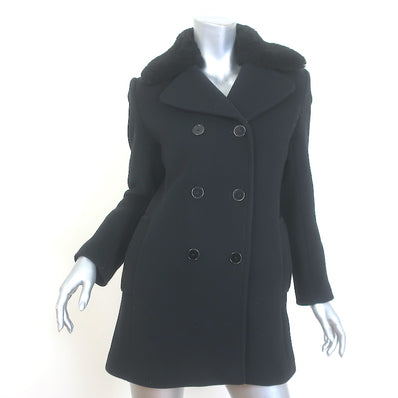 Sandro Shearling-Collar Pea Coat Black Wool Size 38 Double Breasted Ja...