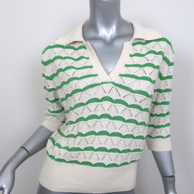Sandro Short Sleeve Polo Sweater Lilio Ecru/Green Striped Pointelle Kn...