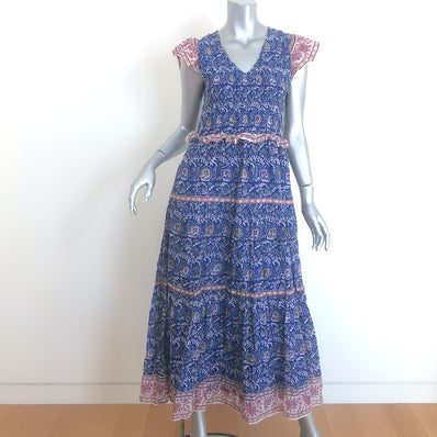 SEA Brigitte Tiered Maxi Dress Navy Paisley Print Cotton Size Small