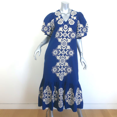SEA Manuela Embroidered Midi Dress Blue Cotton-Linen Size Extra Small