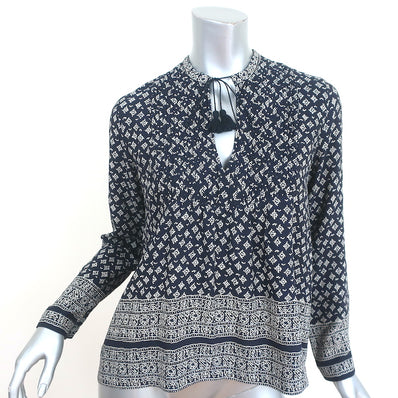 SEA Tassel Top Navy Printed Silk Crepe Size 0 Long Sleeve Blouse