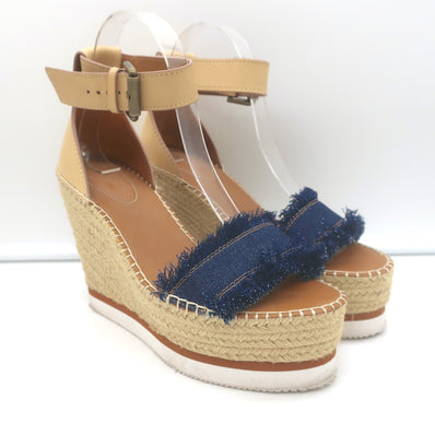 See by Chloe Glyn Platform Espadrille Wedge Sandals Denim & Leather Si...