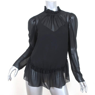 See by Chloe Ruffled High Neck Blouse Black Chiffon Size 38 Long Sleev...