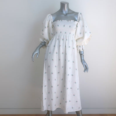 Sleeper Atlanta Smocked Midi Dress White Floral Print Linen Size Extra...