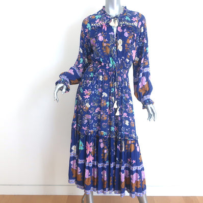Spell & The Gypsy Zahara Midi Dress Blue Metallic Floral Print Size Ex...