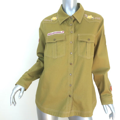 Spell Foxglove Embroidered Shirt Olive Cotton Size Small Long Sleeve T...