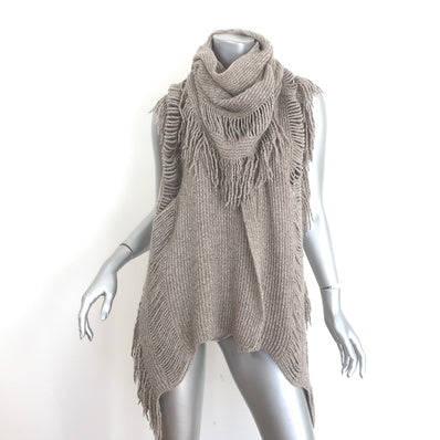 Stella McCartney Fringed Turtleneck Sweater Taupe Ribbed Cashmere-Wool...