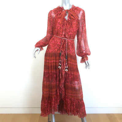 Zimmermann Edie Belted Maxi Dress Red Paisley Print Ruffled Silk Chiff...