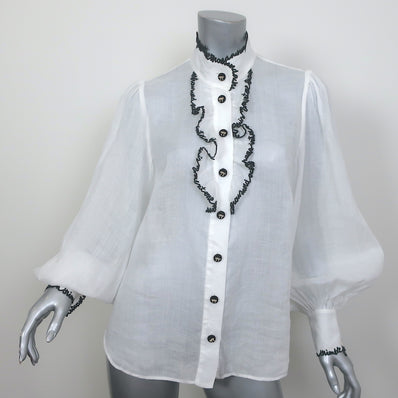 Zimmermann Dancer Embroidered Ruffle Blouse White Ramie Size 3 Long Sl...