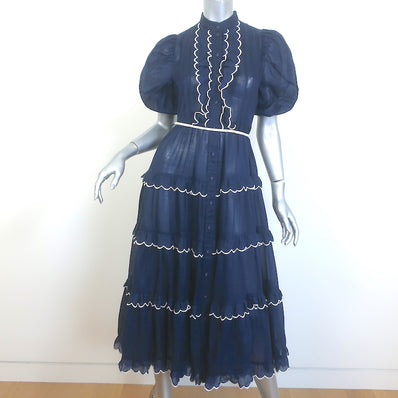 Zimmermann Aliane Scalloped Frill Puff Sleeve Midi Dress Navy Ramie Si...