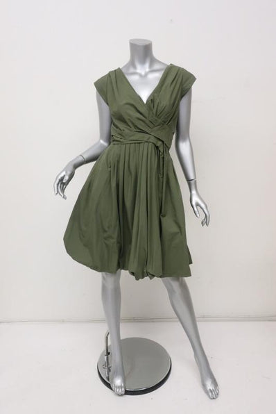 Aspesi Dress Olive Pleated Cotton Size 44 Cap Sleeve Fit & Flare