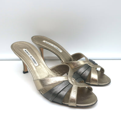 Manolo Blahnik Slide Sandals Gold/Gunmetal Bicolor Metallic Leather Si...
