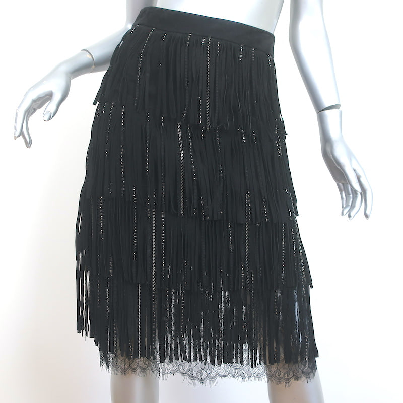 Alice + Olivia Misha Fringed Suede Midi Skirt Black Size 2 NEW